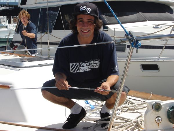 While I was futzing with the winches, Jesse and his apprentice Jay showed up. These guys are from West Marine Alameda, and Jesse is a pro. He's also very easy to work with and schedule. They started installing the lifelines, replaced the jib wire/rope halyard, and rewired one of the spinnaker/whisker poles.