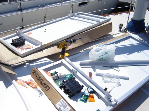 I worked all day on building mounting brackets for the solar panels. I used 1/8" thick aluminium angle-iron, 1.5" to a side, as mounting rails. I bolted these to the panel's aluminium frame, and cut holes to hang the panels from the 1" rails on the side of the boat. The frame is connected to the rails by nifty 1" rail clamps. It was awesome to see the plan come together.