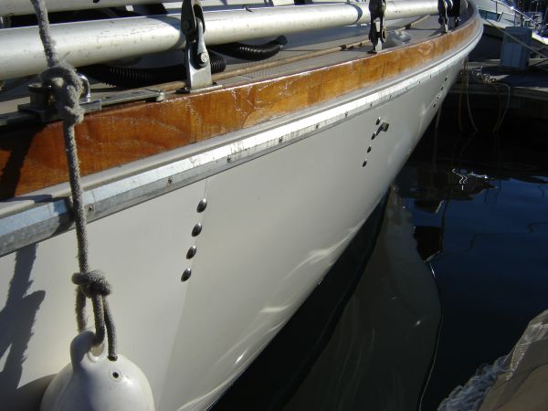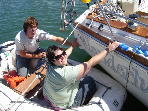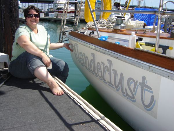 She poliglowed the transom while I made several silly trips to the hardware store for different parts. The boat now looks like new. The hulls shine, the name is gorgeous, the wood glows - it really looks divine. If only we had sails...