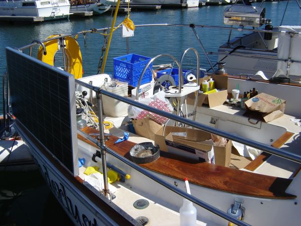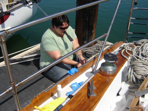 Briana organized the interior, did a little remote-operator phone shopping for me at Home Depot ("How big is the bolt? No, I need 1/4"-20 stainless with nylock nuts! Look harder, they have to have them!"), and finally cleaned the entire boat with Poliprep.
