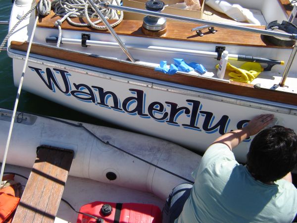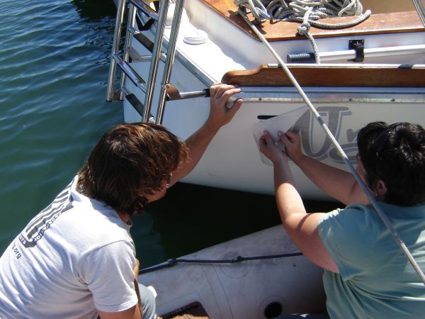 Removing the cover from the lettering was a delicate procedure. We really took our time to make sure it was done right. The name looks just amazing. We went with an online company Cap'n John's Boat Lettering, and the results were spectacular.