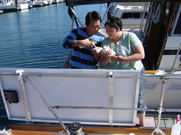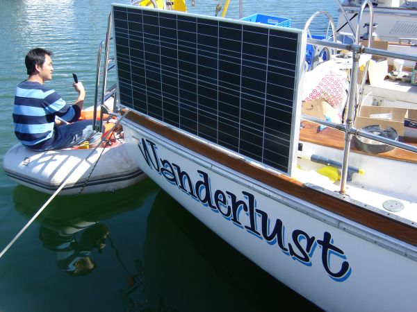 I went back to work putting the final touches on the solar panel mounts while helping Briana apply the vinyl boat lettering. We really took our time making sure everything was lined up properly and the letters were sticking.