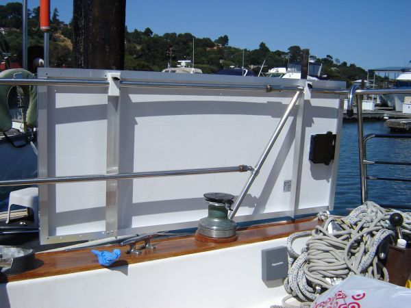 Somewhere in here I finally finished the panel mounts and installed them on the stainless steel rails we previously put on the stern. I can't tell you how wonderful it feels to have everything come together like this: the panels look like they're made for the boat, they're the perfect height, and the rails are the perfect size and shape. It looks like it was designed to be that way.