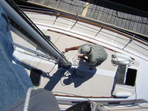 Briana left and I went up the mast, with Wyn's help, to install a block for flying flags off the spreaders. I did a few other jobs, including cleaning the plastic hatches with another miracle material called Plexus, before Mike and Sam arrived about 4PM.