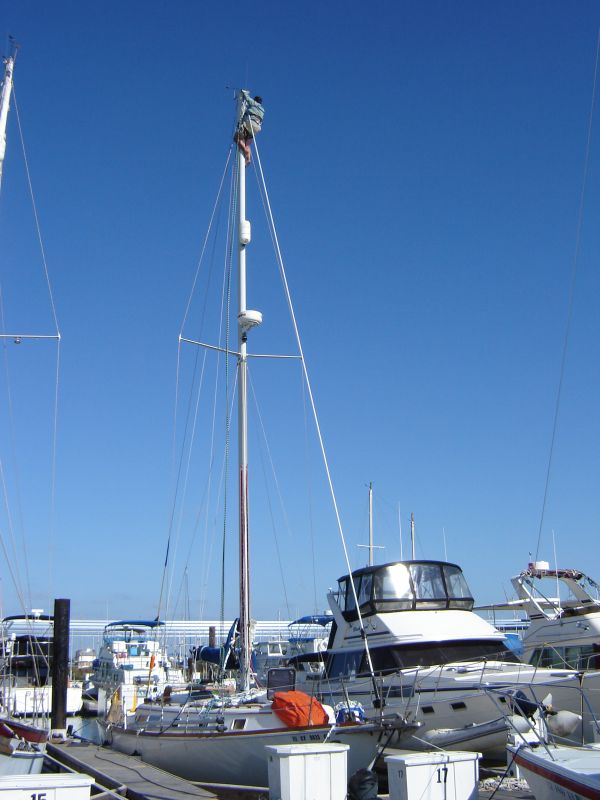 Next was adding a pair of halyards - one for the spinnaker, one as an emergency backup. Sean went up the mast to attach and safety-wire the blocks. Sometime in here, one of our dock neighbours Henri dropped by with the news that Christmas was coming early for us! He had bought a boom preventer - a device intended to slow the boom down during an accidental jibe - but it wouldn't fit on his boat. He gave it to us! Thank you, Henri!