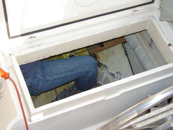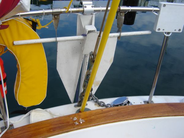 We mounted two anchors on the bowsprit and a third on the stern. Our primary anchor is the 45# CQR, with 100' of 3/8" BBB chain and 300' of 5/8" three-strand rode. Our backup bow anchor is a 45# Bruce with 50' of 3/8" BBB and 150' of 5/8" three-strand rode. Our stern anchor is a huge 45# Danforth with another 50' of 3/8" BBB and 150' of 5/8" three-strand rode. Any one of these anchors is huge massive overkill for Wanderlust's size and weight.