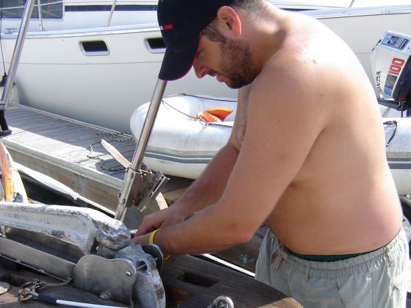 We also changed sails, fixed a few sail-related problems, added reef rigging components, stowed parts, drilled holes, attached electronics, etc. Just getting the dinghy and outboard onboard was a challenge! Good thing we installed extra halyards.