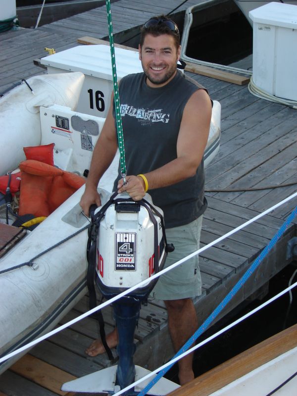 Sean hoisting the outboard