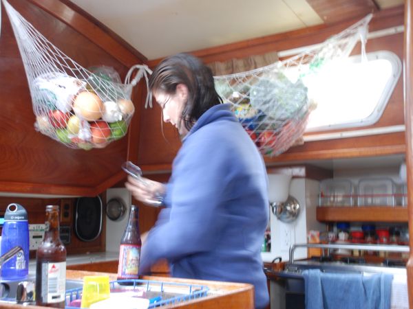 We had a nice yummy meal and settled in for the evening. Mike and Sean got to try out the leecloths Mike designed and built for us. These nets clip around the bunks and keep the occupant from falling out in rough seas or rolling anchorages. Mike rules, but you all know that already.