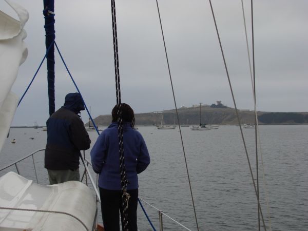 Half Moon Bay has a rocky entrance that requires vigilance, but we had a cruiser's guide, a chartbook, two GPS', and the fog lifted enough for us to make out the bouys. No problemo!
