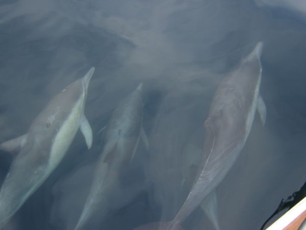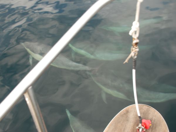 Several different pods came over to check us out. There must have been something like 40-50 dolphins dancing around us.