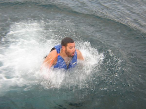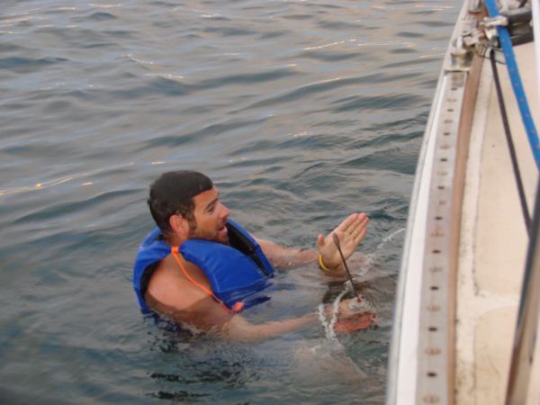I guess it was colder than we thought in there. Sean poked and probed at the exhaust valve, but met no resistance and eventually was turning blue from hypothermia. We reluctantly lowered the swim ladder and allowed him back onboard. The head was still not operational. Mutiny was again being discussed.