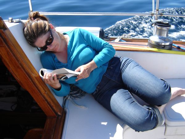 Sara helmed while Sean and I dropped the jib, folded it on the foredeck, and hoisted the genoa. The bigger sail is much bigger, much lighter, and really made a huge difference. In the light winds we were cooking at 6 knots! Awesome.