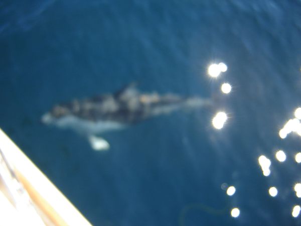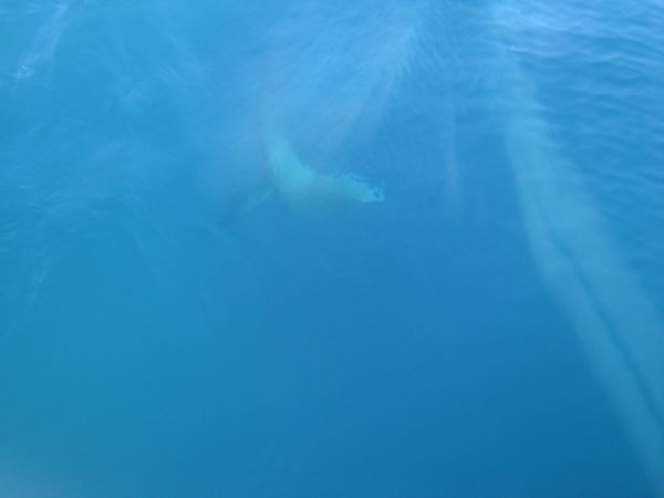 It was a relaxing day. The weather was beautiful: sunny, cloudless, and warm. We all chilled out and the boat droned South on autopilot. I got some webpage work in and Sean and Sara both read. Sometime during the day we think we saw whales off our starboard beam, and I got a blurry picture of something big swimming underneath us. It didn't look or act like the dolphins we had seen earlier!