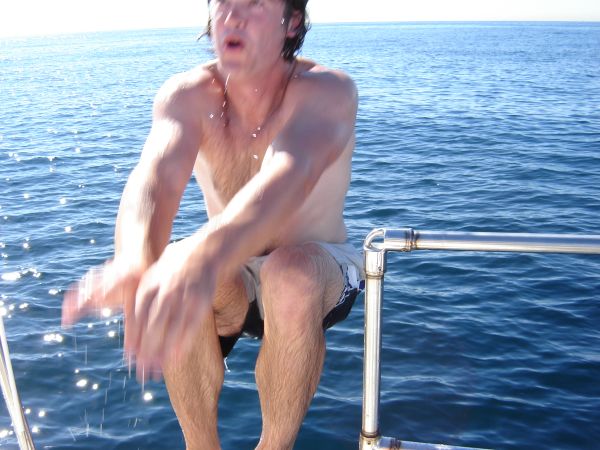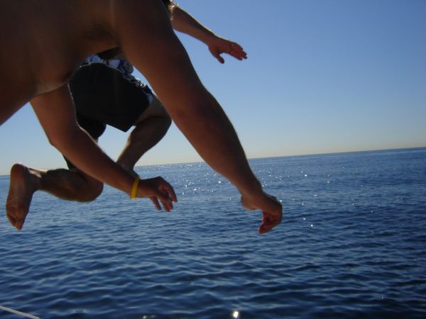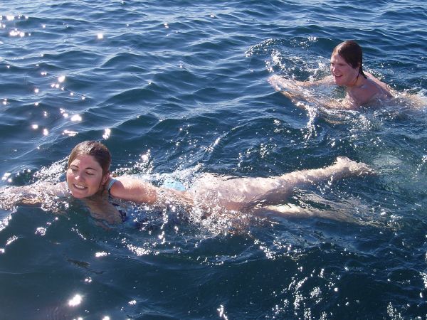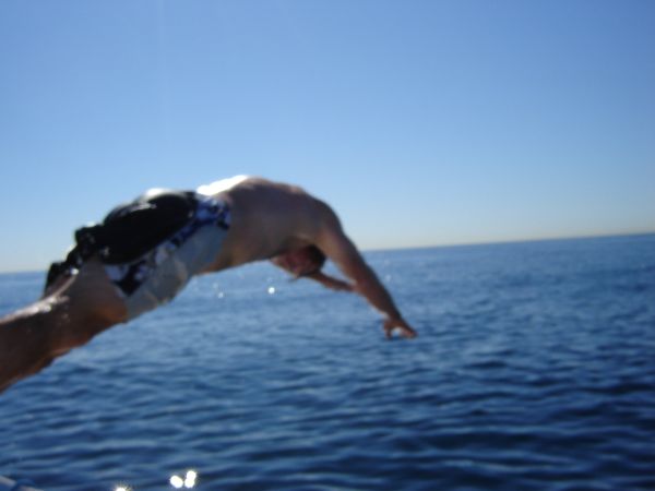 We were all getting hotter, and when the wind finally went away completely, we decided to take a swim. We checked the depth guage: "---", we checked the charts: "2900ft", perfect.
