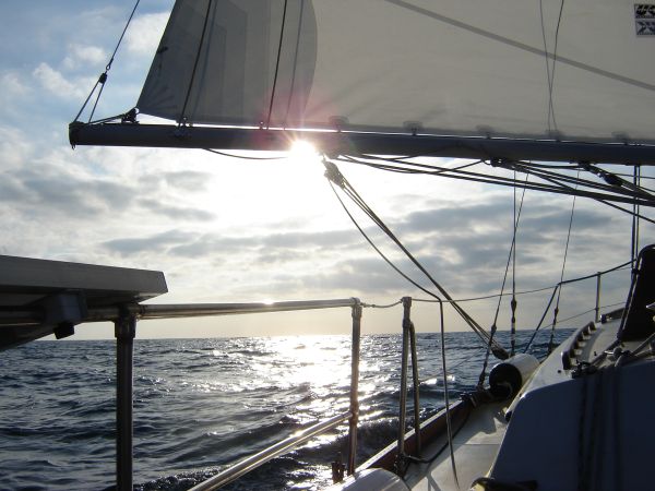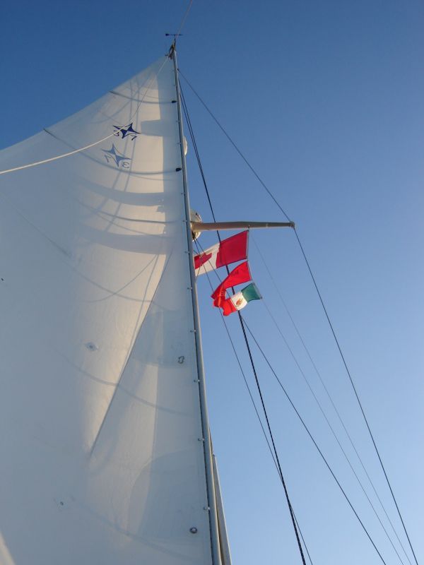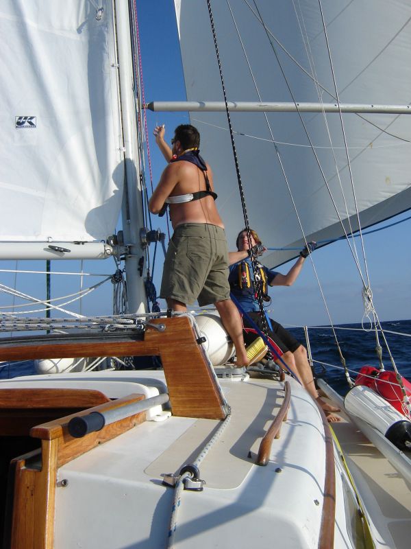 We experimented several times with different sail configurations, moving to a deep deep reach to try to gain more boatspeed, and changing back when the speed didn't materialize and the waves started making everyone feel queasy. Without a large spinnaker we really aren't well-prepared to go directly downwind. It's on our shopping list for sure.