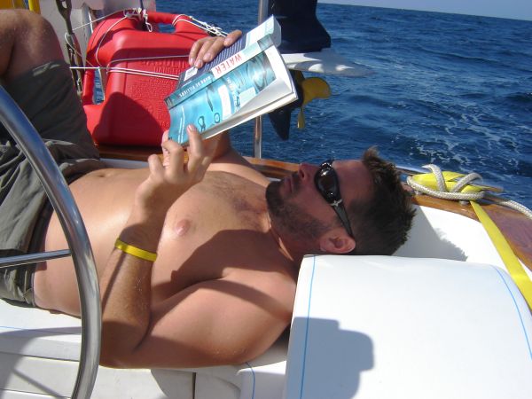 It was a super chill day; Will and Sara rejoined the party around noon and everyone lay around reading, assuming different draped positions all over the boat as we enjoyed sunny solitude at sea with the light winds. Sean made some pizza dough after an easy and super-yummy grilled-cheese lunch.