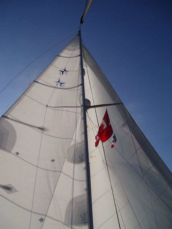 In the early afternoon the wind increased and was pushing some sizable waves. Wanderlust picked up her heels and started to move! We were occasionally close to 8 knots while 'surfing' down the faces of waves overtaking us. This is pretty cool because it's faster than our 'hull speed', the theoretical limit a non-planing boat can move! The speed was a lot of fun and not at all unnerving. The boat was stable, and we maintained our casual attitudes. Great sailing.