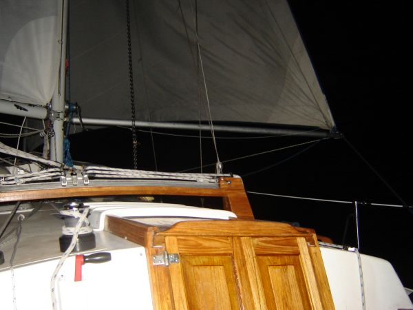 The watch was fairly easy; nothing difficult except trying to stay awake! The sea was relatively calm with slow swells and little wind chop. We traveled under headsail for about an hour before Sara took the wheel and hand-steered while Will poled out the 150% headsail. Under this sail configuration, with the main extended all the way out in the other direction, connected to the side toe-rail with a spare boom vang, the boat accelerated to ~5 knots and the sails quit flogging.