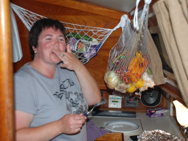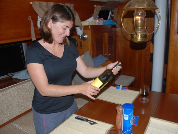 As dinner approached, Will totally lost his ability to communicate and maintain conciousness, leaving Sean and the girls to fix the dingy and prepare dinner, respectively. Sean put together a temporary patch consisting of 3M 4000 marine adhesive, while Sara and Briana prepared a sumptuous dinner of pork tenderloin. Three bottles of wine and a whole roast later, the three crew observed the amazing sea of anchor lights in the dark anchorage.