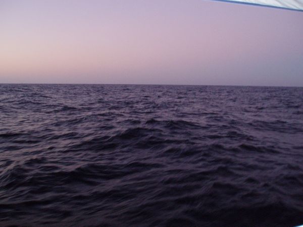 Sean joined in the fun about 4:30AM, and the pair did their best to get the boat moving in the tiny amount of wind. No matter how they were trimmed, the sails were flogging wildly in the light choppy waves. Flogging sails have a way of wearing you down; the sound and jarring action will make you try anything to mitigate the noise.