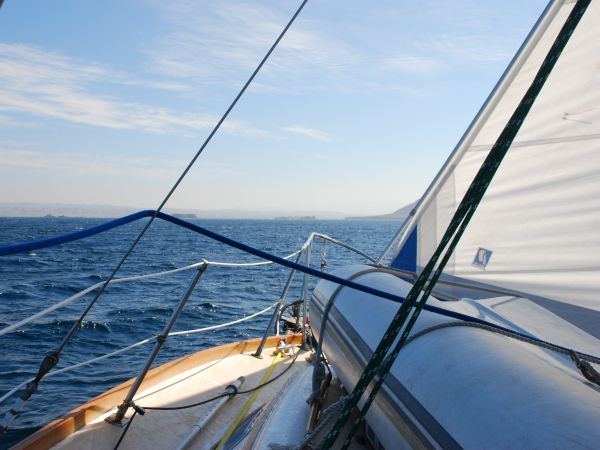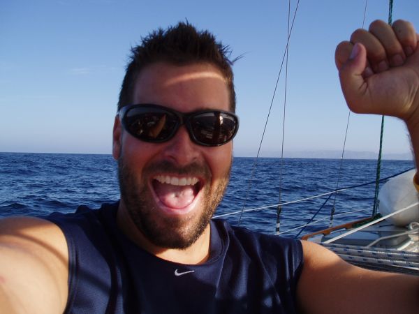 The wind finally picked up at the same time as a morning greeting from some friendly dolphins. They didn't stick around too long, since at 0.5 knots we weren't too much fun to play with. We crossed the finish line at about 7:45AM and all were overjoyed.