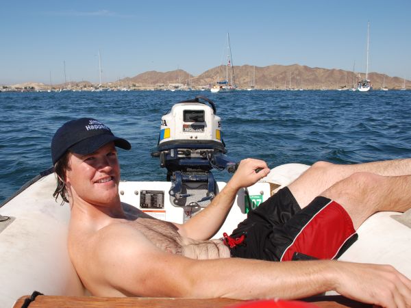 Happily we crawled in and headed back to the boat. About halfway there, Will noted that the boat seemed awfully soft; Sean eventually located a small tear in the front of the dingy where it had been dragged across the razor sharp edge of the stairs at the pier. So much for looking out for our dinghy! Purpeat was unable to plane, and was barely afloat when Sean and Will pulled up next to Wanderlust and quickly climbed out. A patch job was in our future.