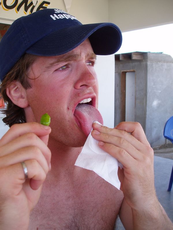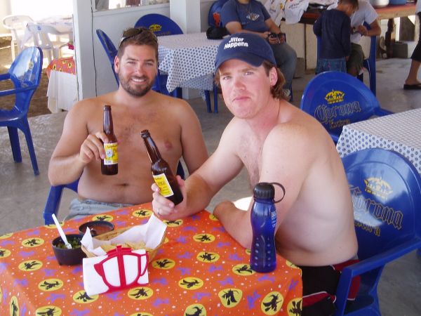 That's right, fresh lobster tacos, US$1.50 each. Gotta love the place! We were told that finding fresh lobsters would prove extremely difficult given the Mexican fisherman's collective, which prevents selling lobsters to anyone except restaurants, so we were happy to enjoy them prepared for such a reasonable price! An error in calculation of a Mexican's sense of spiciness led us to eat whole chilis of some unknown variety. Mistake. We barely recovered in time to pay la quenta and head back to the boat.
