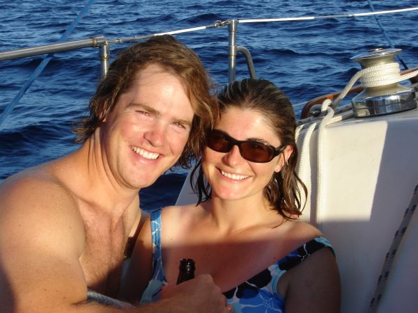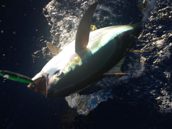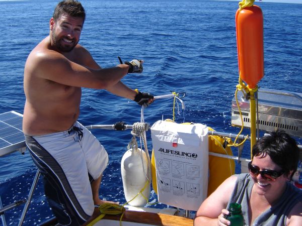 We were sailing along in the decreasing winds when suddenly Sean noticed we'd hooked a fish! Sweet! He donned the gloves and reeled the large yellowfin tuna in. We must have been dragging him for a while because he didn't fight until we got him close to the boat, but once we saw him and he saw us, the fight was on! We got only one picture, estimating his weight at 30-35lbs, before he jumped, bucked, and spat out the lure. Curses.