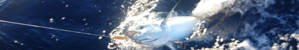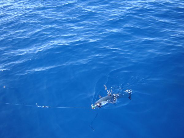 At about 2:30PM we caught the most beautiful yellowfin tuna any of us had ever seen. With our mouths watering and all of us dreaming of sashimi, we grabbed the fish book and were looking it up when the bugger jumped off the line at the last possible instant. Sara's theory is that it saw the bat coming and mustered up one final spurt of energy to jump off the hook. Next time, we won't bother to identify you fishies: if you're on our line, you're dinner.