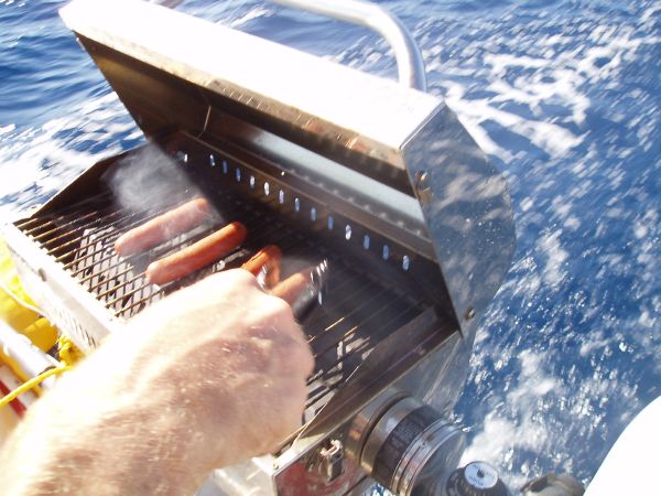 We sailed until noon, when the wind died. The wind dies a lot in Mexico, we are learning. Oh, well. We thought it would be the perfect opportunity to grill some sausage and have an American lunch--cokes and hotdogs, anyone? After lunch, we turned on the engine. Everyone was ready to make some headway to Cabo, and since we had already forfeited our 'hardcore sailor' title, motoring seemed like the thing to do.