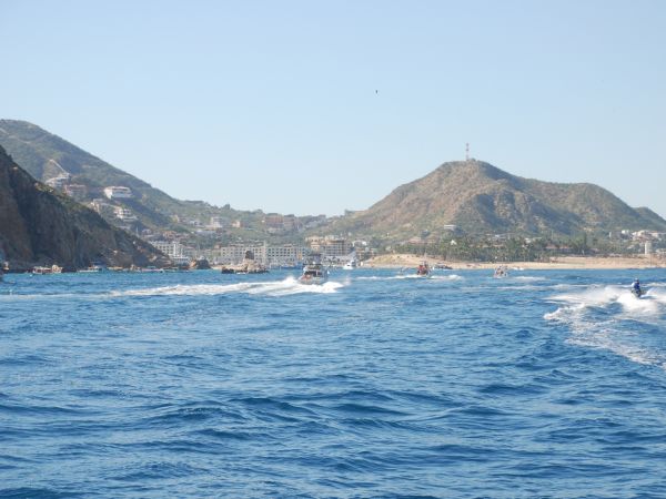 We passed the famous Cabo Arch on our way into the bay, and debated heading in to the fuel docks to get diesel. It was now almost 3PM and hundreds of fishing boats were going into the harbour under full steam. We decided to head straight to our anchorage and get fuel later; we had been warned that sportfisher guys are territorial and pushy around fuel docks.