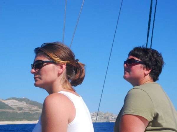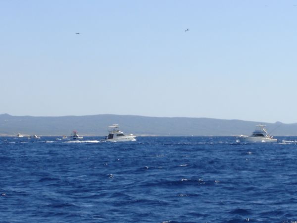 Briana and Sean brought us closer to Cabo, dodging a cruise ship and the sportfisher boats that were zooming around like mad, lines streaming from huge spreaders. We sailed over one of the underwater mountains Cabo is famous for - where the sea goes from more than 2000ft deep to less than 60ft deep in a small little area - and saw hundreds of birds, tons of dolphins, some seals, and at least fifteen sportfishing boats clustered around that one spot.