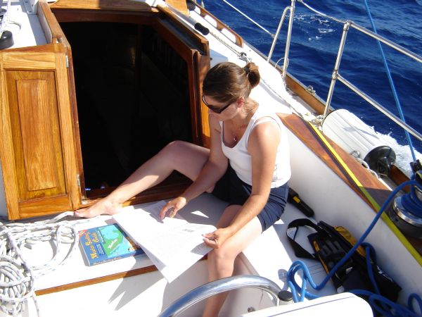 When Briana came up to the cockpit at 5:30AM for her turn at the helm, she didn't get a "good morning," instead her greeting from Will was, "Dude, we're declaring war on fish!" Talking excitedly about lures and hooks and weights and monofilament and gaffs and fish bonkers, Will was more than a little excited. He was quickly relieved and went to bed, dreaming about fish.