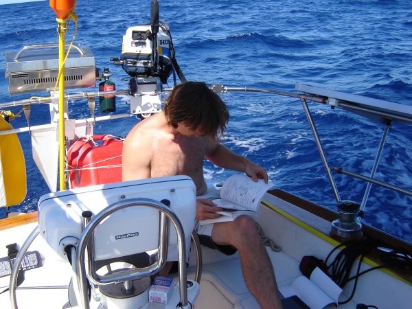 With the two delicious tuna we lost fresh in his mind, Will read our "Cruiser's Guide to Fishing" book from cover to cover by the light of the moon and the GPS chartplotter. We were motorsailing at what seems to be our cruising speed, 6 knots, occasionally dodging other boats doing the same.