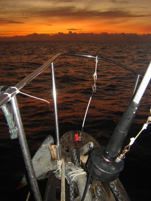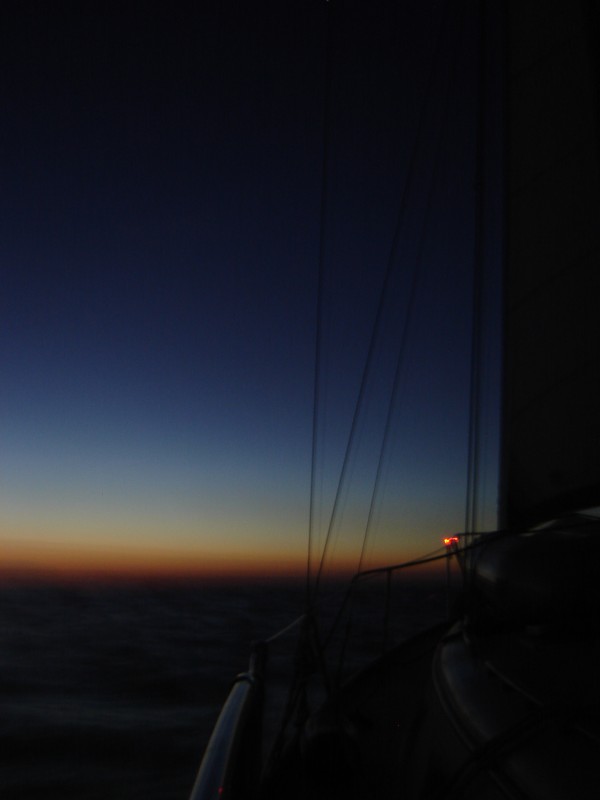 The midnight to six AM watch was easy, our red-LED headlight was serving nicely as a nav light, and we were again blessed with another perfect sunrise.