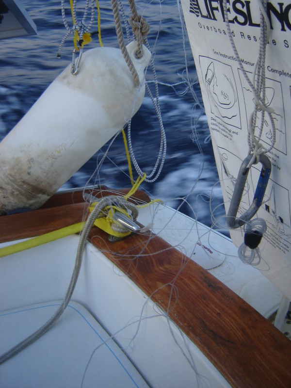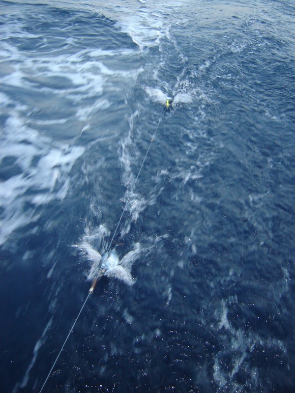 Just before sunrise I had let out the fishing lines and within half an hour we had two hits! Normally this is a good thing, but these tunas wanted to punish us for catching them, so they somehow managed to totally tangle the three lines we were dragging. It took an hour to untangle the lines enough to separate the first fish!