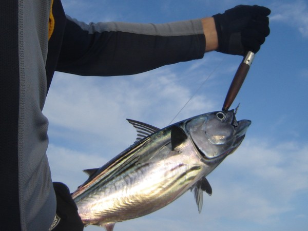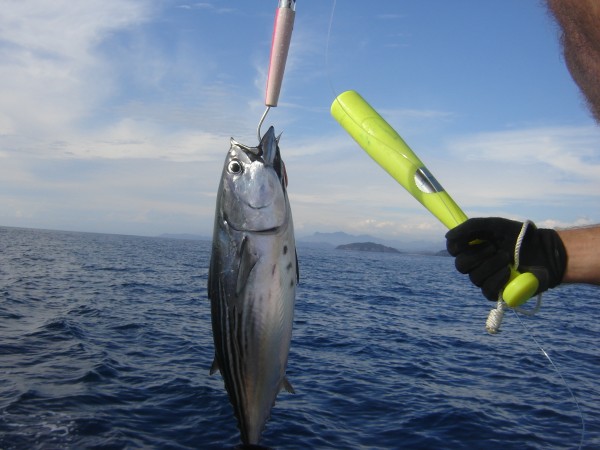 Both were little beauties: skipjack tuna, 10-15lbs. The meat is red and oily, but it marinates well with soy sauce and honey, and they're easy to clean. We used our new fish bonker to stun them, and drowned them quickly in tequila. What a way to go.
