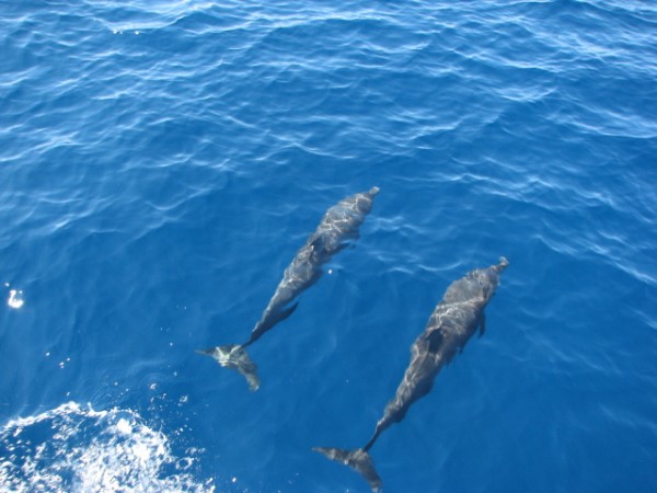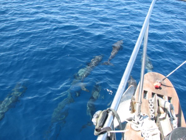 With the fish fillets marianading in the fridge, and the solar panel back to its day job, we resumed our ever vigilant watch, and after several unphotographable leaping bat rays and diving turtles we were joined by a school of dolphins that were close enough for long enough for Wills to get some excellent pics.