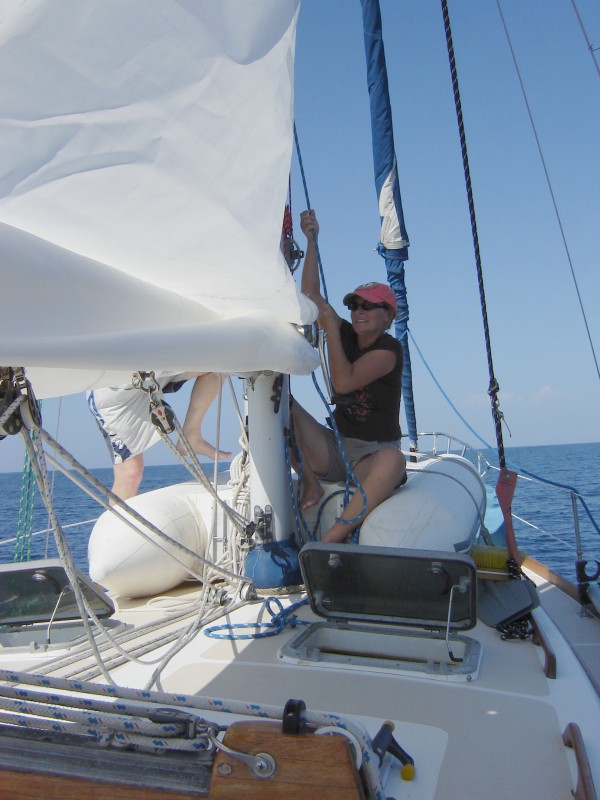 Sara hauls up the mainsail