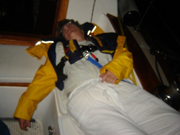 Soon it was time to eat our pre-prepared food and get ready for the first overnight - 's funny how we wear swimsuits by day and full Monty foul weather gear at night - and we're not all fetishists. We also wear life-vests and safety lines. Sara & I took the first watch from seven 'til midnight and with the moon in its third quarter we got to see the stars, so many stars it's hard to make out the familiar constellations and you realize the milky way's not just a candy bar.