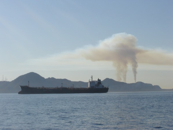 Clear blue water, a pristine view in every direction but landward where there was a long brown plume extending from the north-eastern horizon. As the day wore on the culprits came into view, three chimneys. As we looked at them we saw a row of silver dots as well, which we couldn't figure out - the boat moves about too much for a clear view through binoculars, or my image-stabilized camera, so we settled for the most likely solution, an alien landing aid.