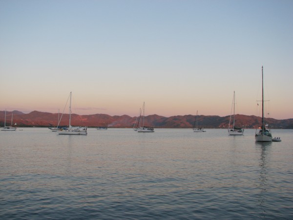 It's a very popular spot with about 3 dozen yachts at anchor when we arrived. We had some fun with the phosphorescent critters after dark. Sara stirred up a sparkle with the deck broom, the Will said; dive in. I dove and was surrounded by stars, waving my arms produced showers of sparkles at my fingertips, while vigorously treading water produced the difuse glow. Experiments pumping the head in the dark lead me to believe the bright flashes are caused by contact with the air - dunno 'bout the diffuse.