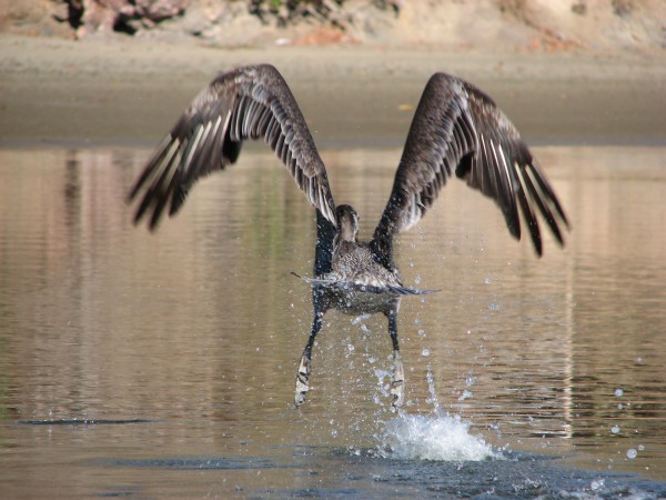 Disturbed pelican flees Purpeat
