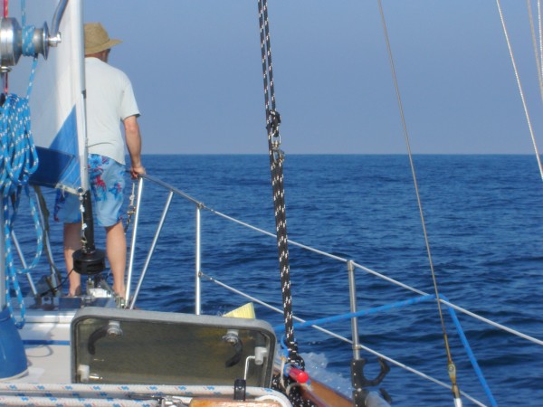 Without sails and a nice lean to moderate the motion, we were also rolling a fair amount. It was miserable down below, and Ann quickly became sick while tending to John in the V-berth. John was fine, just still very hot.