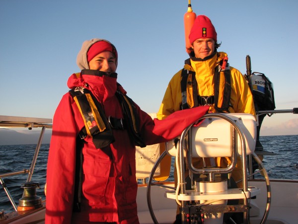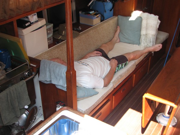 Sara and I took one-hour shifts manning the helm, the off-watch person curling up and sleeping in the lap of the helmsman. It worked great, we let Ann and John fend for themselves downstairs and focused our efforts on getting us and them to PV as quickly as possible. The biggest waves we met were maybe 12ft, but I think they averaged 7-9ft, and we were still driving straight into them. As we rounded several points along the way the wind and waves shifted to stay directly in front of us.