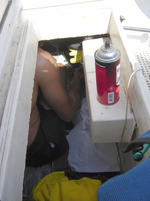 I tried to repair the PCB by scraping free most of the corrosion, spraying it with electrical contact cleaner, etc, but all to no avail. Okay, I guess we'll ask Mari to find, buy, and bring a new C40 controller down with her to PV. It's frustrating, but this is a big part of being a cruiser: endlessly fixing stuff in cool anchorages.