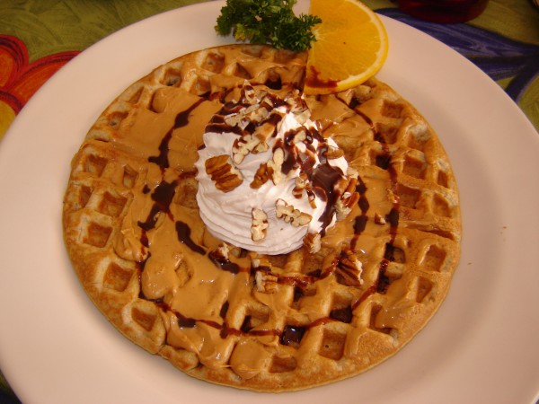 Waffle, peanut butter, chocolate, and whipped cream for me