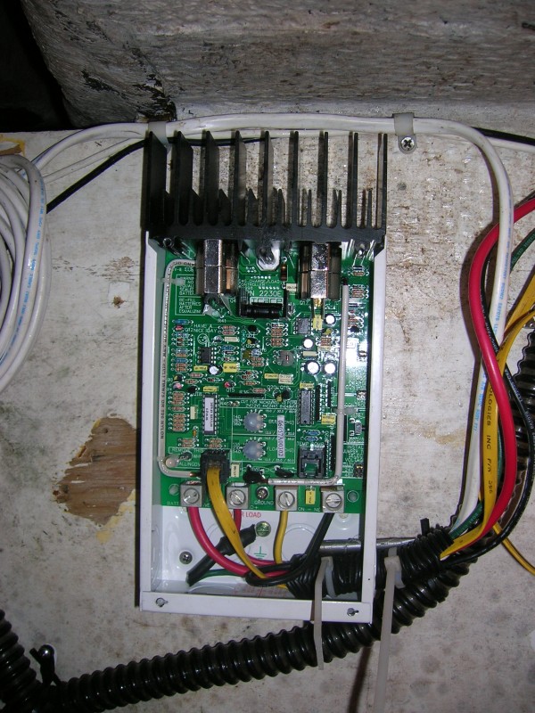 When we arrived I unpacked our starboard lazarette, climbed in, and did a little diagnostics work to discover our Xantrex Trace C40 charge controller had kicked the bucket. It had been mounted in a poor location by some previous owner and been sprayed with just enough salt water to slowly corrode the unprotected PCB inside the metal case. Argh.