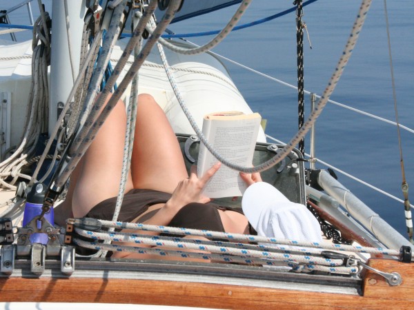 We settled into the rhythms of a nice sail on a warm, sunny day - Sara and I helped to trim the sails and then escaped to the bow to read and catch some sun while Will played DJ, blasting hip-hop for all sailors and sea creatures to enjoy.